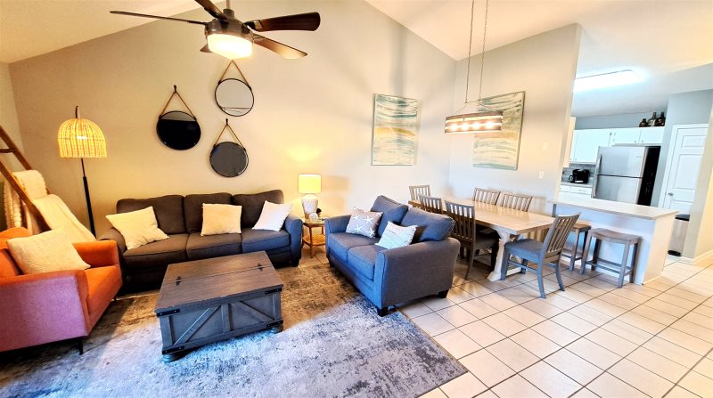Living room has plenty of comfortable seating to watch a movie after spending a day at the beach